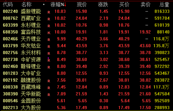 锂矿概念盘中大幅走高,截至收盘,盛新锂能、西藏矿业、永杉锂业、天齐锂业等涨停,华友钴业涨超9%,赣锋锂业涨8%。