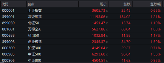 具体来看,沪指盘中强势震荡上扬,深证成指、创业板指涨超1%,续创年内新高。截至收盘,沪指涨0.65%报3605.73点,深证成指涨1.21%报11193.06点,创业板指涨1.5%报2345.37点,科创50、北证50指数均涨超1%,沪深北三市合计成交18742亿元,较此前一日减少245亿元。