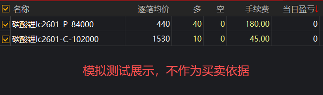 上周五我测白银期权双买,周五夜盘一个就暴涨,买价33.5最高涨到119,就算另一个归零了,这一单也是有77%的收益。赌期权恐怖如斯!今天我再来测一个碳酸锂期权双买,看看这个期权结果会怎样,后面我跟踪一下!