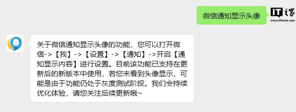 腾讯客服表示:关于消息通知显示头像的问题,不同系统情况有所不同。如果是 iOS 设备,微信已升级到新版本后支持在通知中显示用户头像,但该功能仍在逐步开放中。若您使用的是安卓手机或鸿蒙系统,目前消息通知栏暂不支持显示头像(IT之家注:根据用户反馈,安卓版本早已支持该功能),我们会根据用户反馈持续优化,请您留意后续更新。